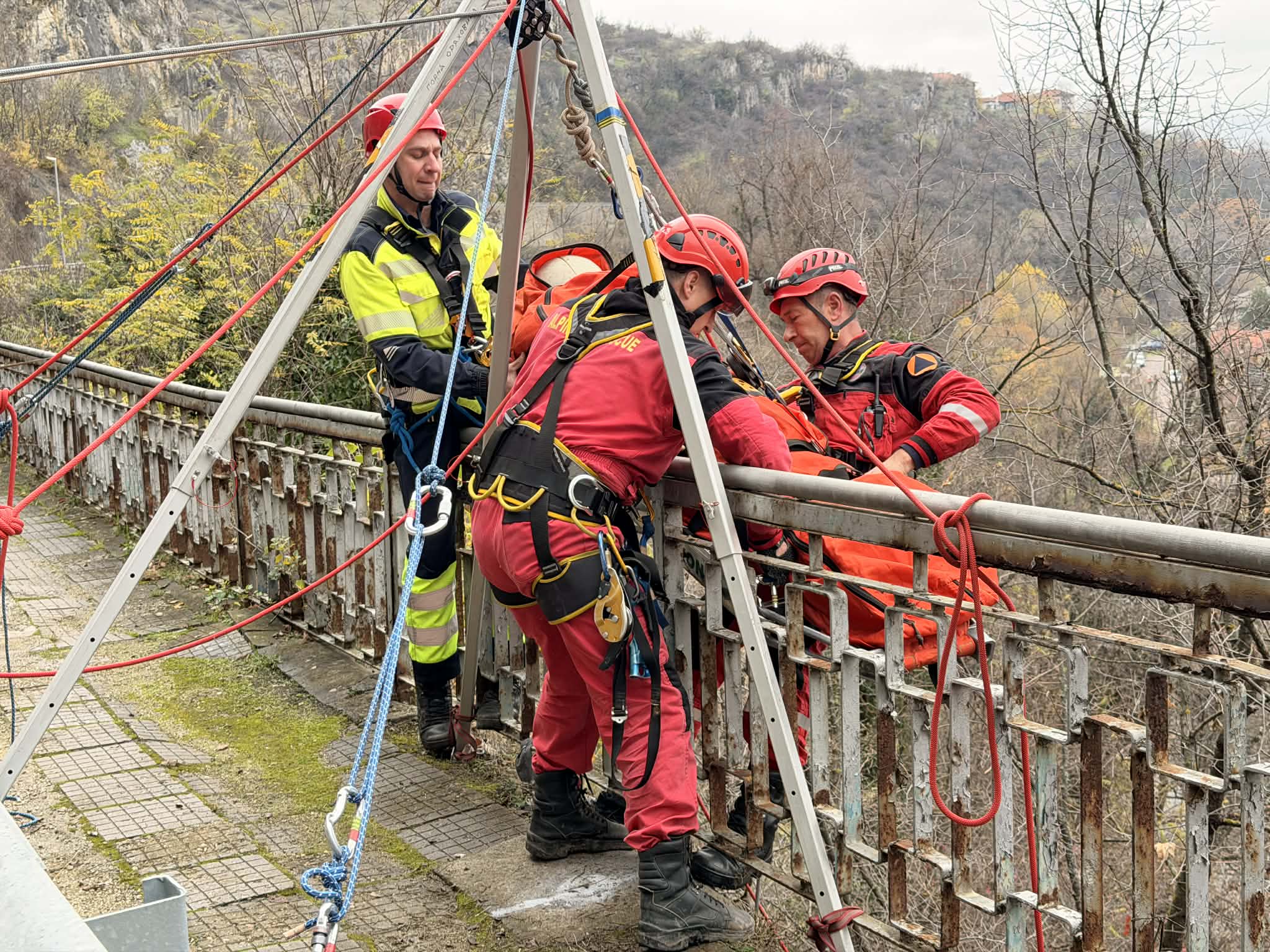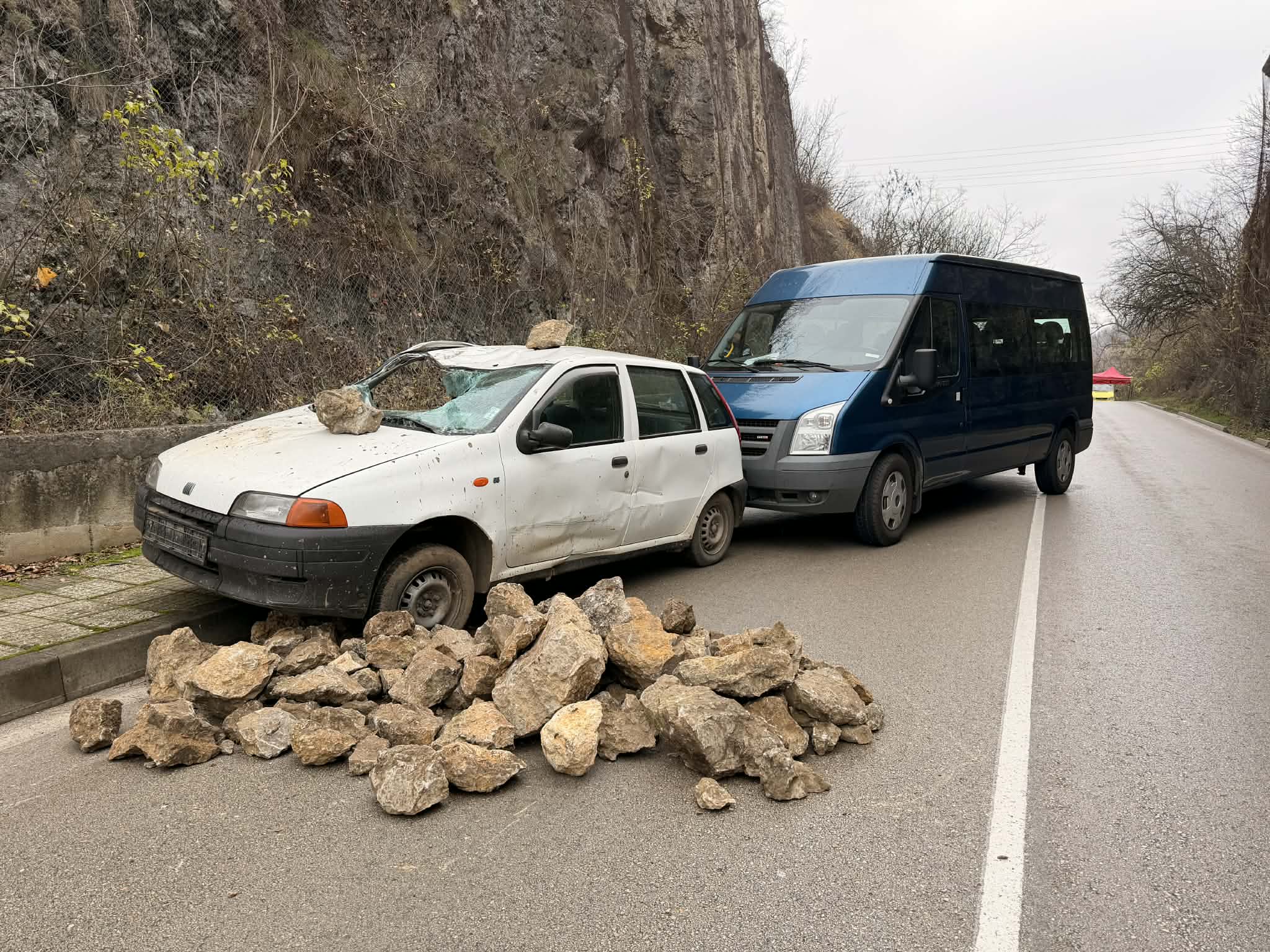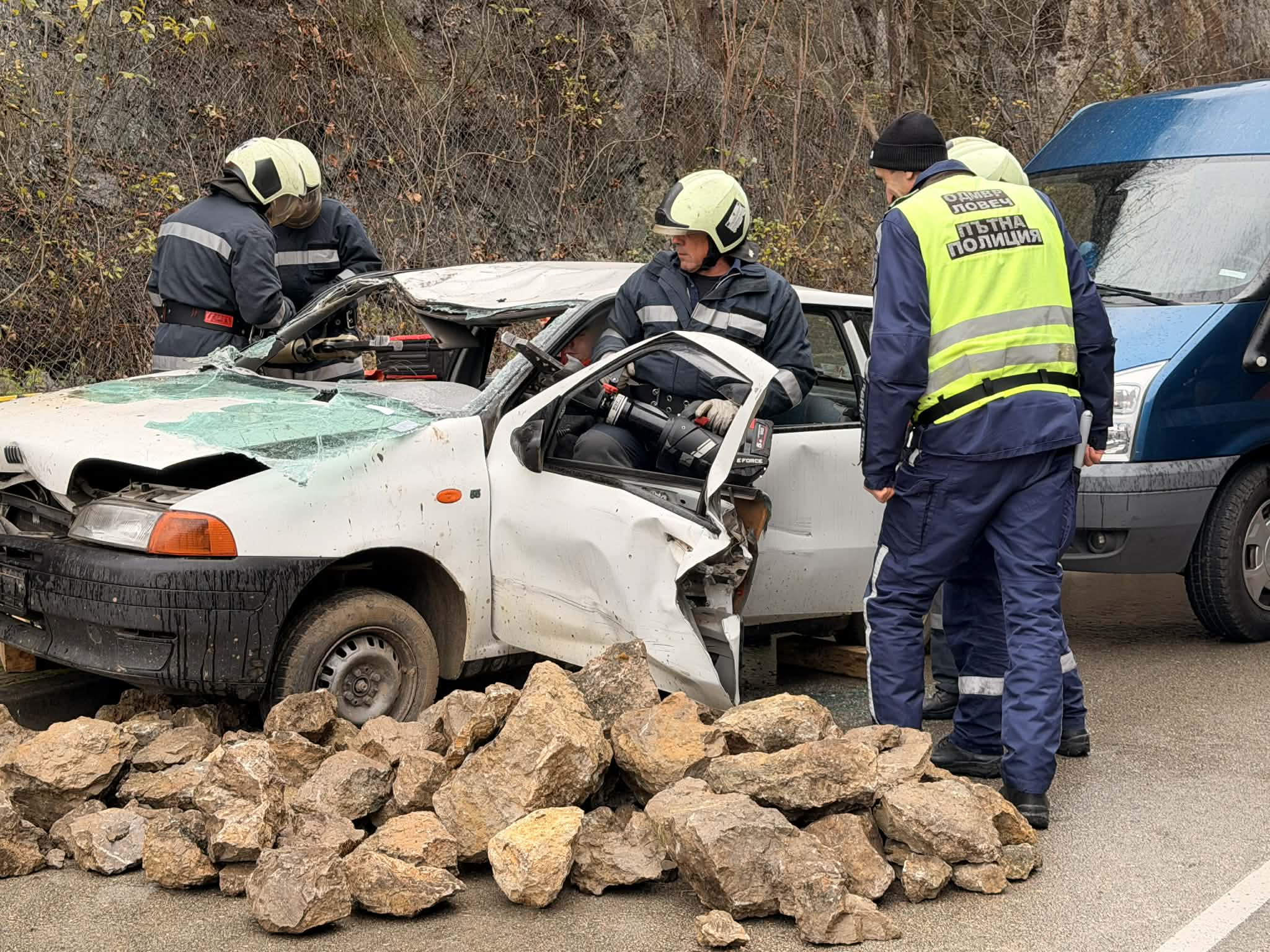 камъни на път от републиканската пътна мрежа с последвало верижно пътнотранспортно произшествие между три МПС – автобус и два леки автомобила. Вижда се и друг лек автомобил, паднал в дълбока пропаст. Има пострадали. Веднага се задействаха силите на ЕСС. На място след срязване на смачканото купе тежко пострадалият бе изваден от автомобила и откаран в болница. На леко пострадалите бе оказана долекарска помощ и психологическа подкрепа на място. Междувременно бе създадена временна организация за регулиране на движението в района на произшествието. Взети бяха мерки за предотвратяване на пожара.