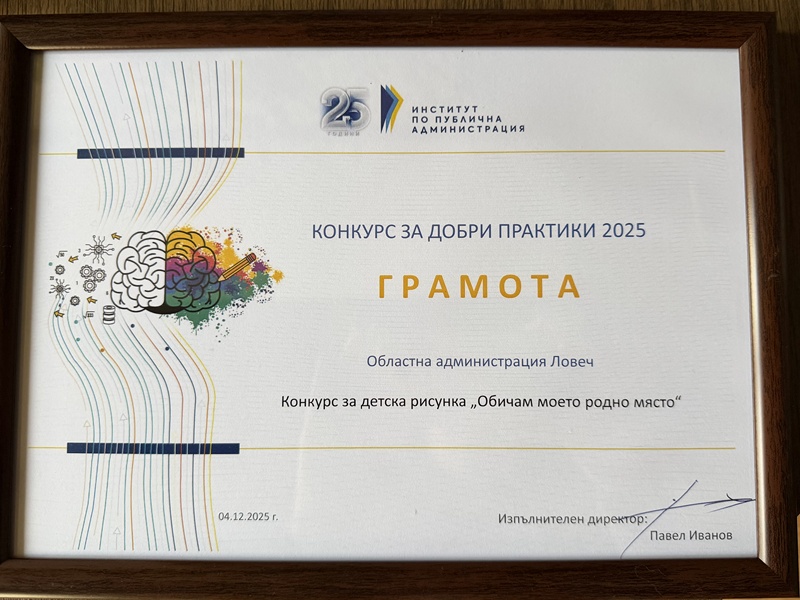 Областна администрация – Ловеч бе наградена вчера с грамота от конкурса за добри практики, организиран от Института по публична администрация (ИПА). Отличието е за постигнат резултат в дейността на администрацията в България. Практиката, която беше представена в категорията „Социална отговорност“, бе конкурс за детска рисунка „Обичам моето родно място“, който се проведе през април тази година, като идеята е създадените творби от учениците да бъдат...